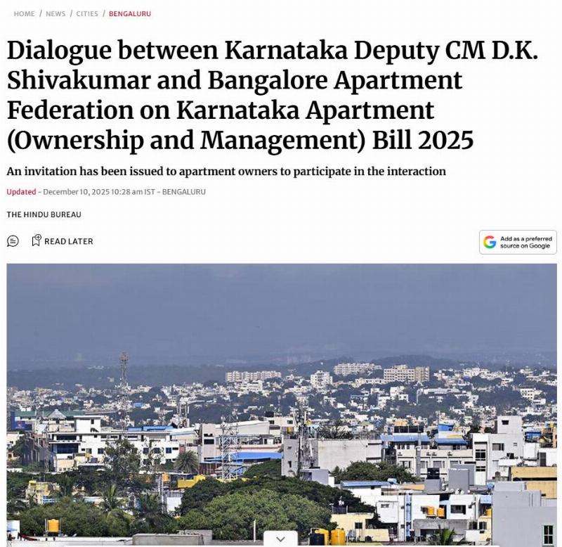 The Urban Development Department, Government of Karnataka, has scheduled a dialogue between the Bangalore Apartments’ Federation (BAF) and Deputy Chief Minister D.K. Shivakumar on December 13 at the